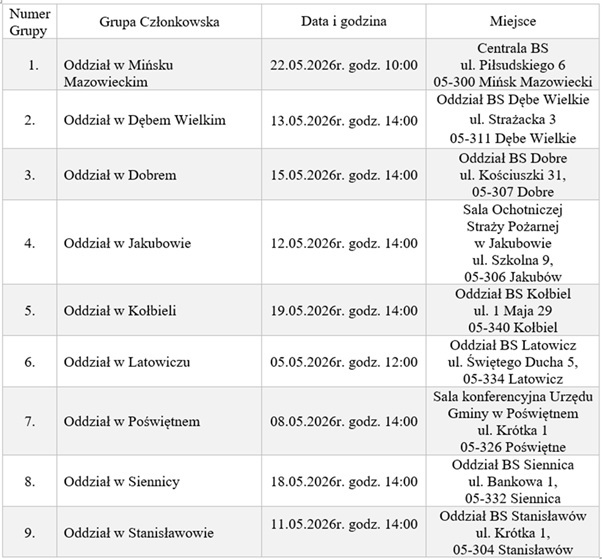 Zarząd Banku Spółdzielczego w Mińsku Mazowieckim, na podstawie §37 ust. 6 Statutu, serdecznie zaprasza Członków naszego Banku na sprawozdawczo-wyborcze Zebrania Grup Członkowskich w następujących oddziałach: